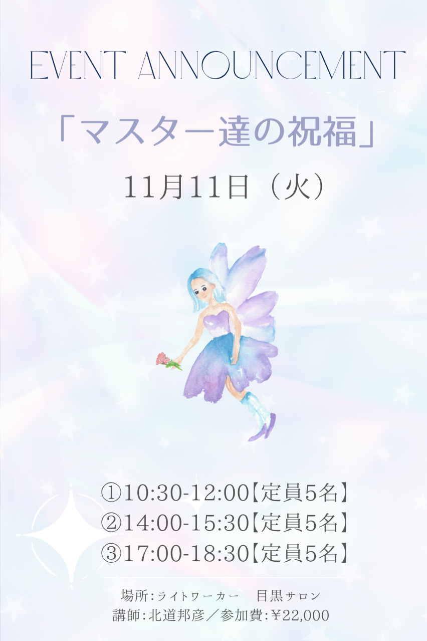 毎年11/11はツインレイのワークショップを行っていましたが、今年はマスターの仲間達からの意向を踏まえ、「マスター達の祝福」というイベントを行うことになりました。